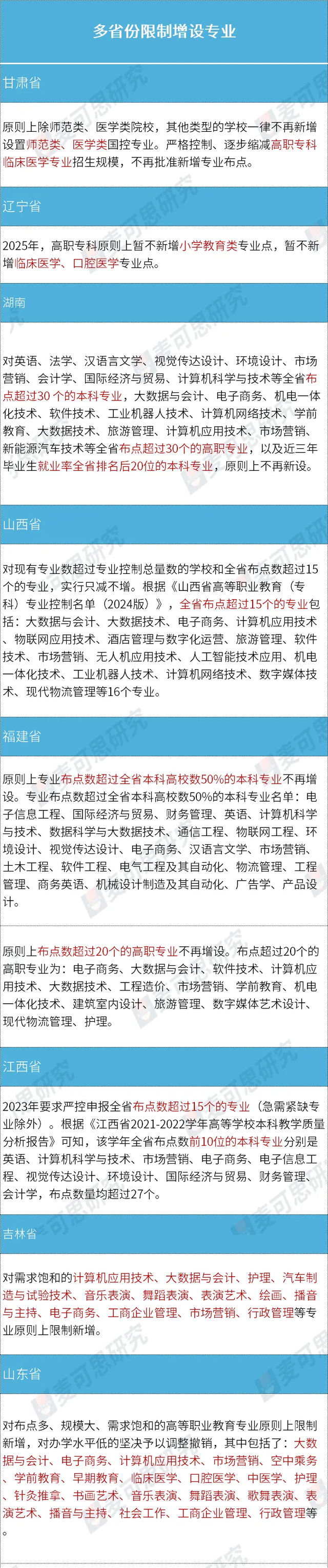 不过还需指出的是,各省份的限制名单范围远大于麦可思的年度红牌名单。这主要体现在: